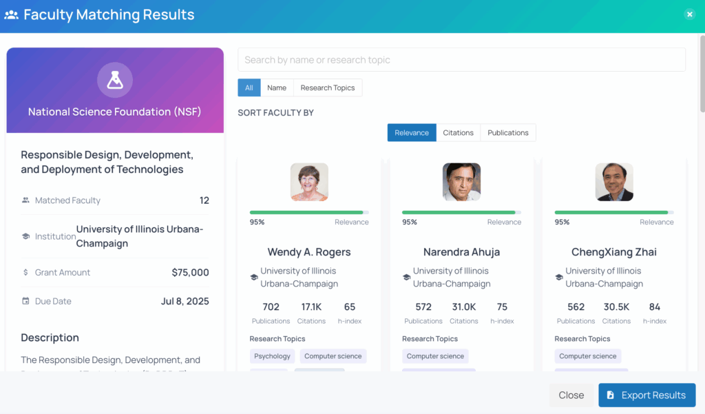 Automatically align each grant with the right faculty based on their expertise, research, and publications. No more manual sorting—FirstIgnite does the heavy lifting, ensuring that opportunities land where they are most impactful.